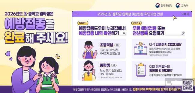 필수 예방접종 항목은 초등학교 입학생의 경우 ▲DTaP(디프테리아·파상풍·백일해) ▲IPV(소아마비) ▲MMR(홍역·유행성이하선염·풍진) ▲일본뇌염이며, 중학교 입학생은 ▲Tdap(또는 Td) ▲일본뇌염 ▲HPV(12세 여학생 대상) 이다.