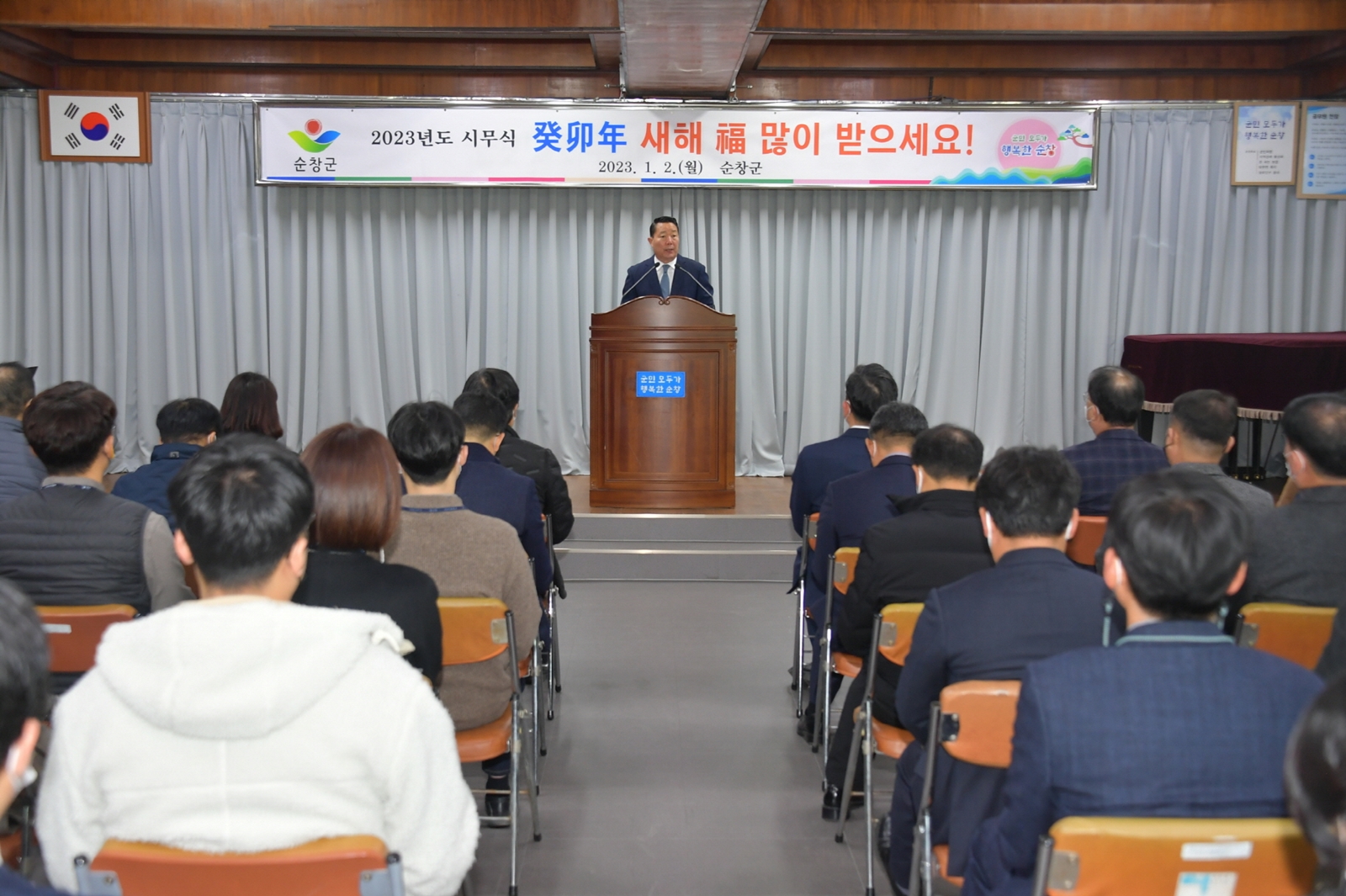 [순창=뉴전북] 전북 순창군이 2일 순창군청 3층 대회의실에서 시무식을 갖고 계묘년 새해 업무추진에 본격 돌입했다. 이날 시무식은 간부 공무원 등 140여 명이 참석한 가운데 치러졌다. 최영일 순창군수를 비롯해 간부 공무원 40여 명은 시무식 행사 이전에 순창읍 충혼탑에서 순국선열과 호국영령에 대한 참배를 공식일정으로 시작했다.