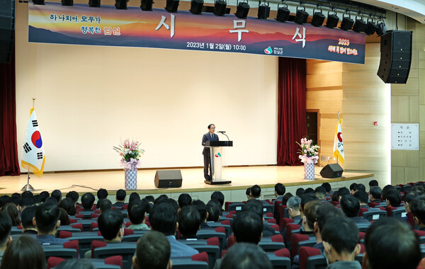 이날 군청 문화강좌실에서 본청 실과소장과 12개 읍면장, 직원 등 300여 명이 참석한 가운데 열린 시무식에서 심 군수는 “지난 한 해, 모두가 혼연일체가 되어 힘을 모아 이룬 결실에 대해 거듭 깊은 감사를 드린다”는 인사로 서두를 열었다.