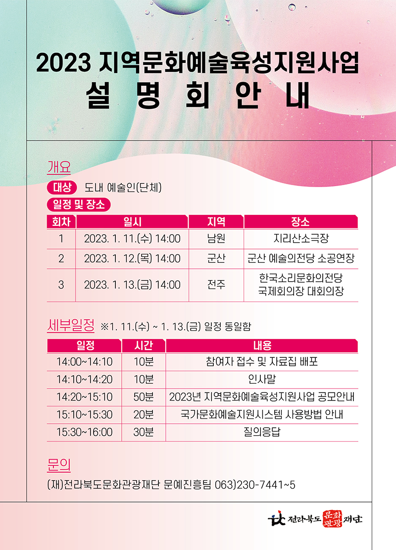 공모 관련 사업설명회는 ▲1월 11일(수) 오후 2시, 남원 지리산 소극장 ▲1월 12일(목) 오후 2시, 군산 예술의전당 소공연장▲1월 13일(금) 오후 2시, 한국소리문화의전당 국제회의장 대회의장에서 열린다.