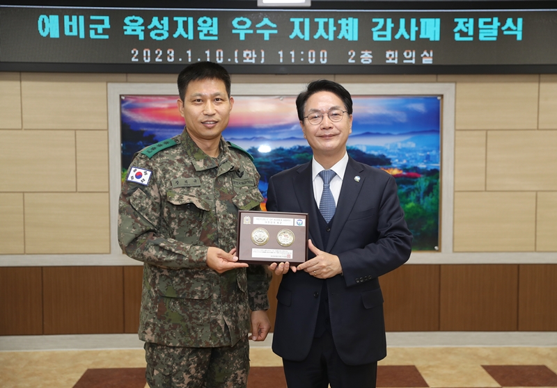 10일 고창군에 따르면 이날 오전 심덕섭 군수와 임정호 고창군의회 군의장이 예비군 육성·지원 우수 지자체에 선정돼 육군참모총장 감사패를 받았다.