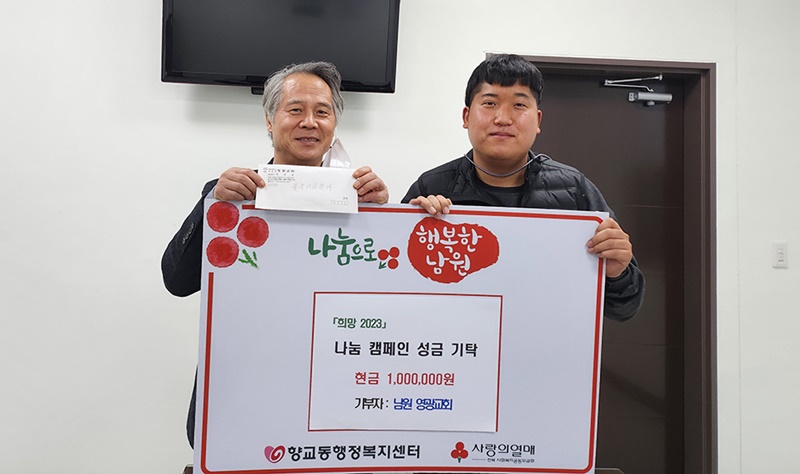 [남원=뉴전북] 연말연초를 맞아 지난 19일 남원 영광교회(목사 박종호)에서 성금 100만원을 희망2023 나눔 캠페인 기탁했다.