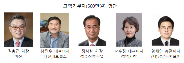 이날 전라북도에 연고를 두고 있는 아신 김홍규 회장을 비롯 다산네트웍스 남민우 대표이사, 수산중공업 정석현 회장, 맥시칸 오수정 대표이사, ()남양공원묘원 임채언 총괄이사 5명이 고액기부자 명단에 올랐다.