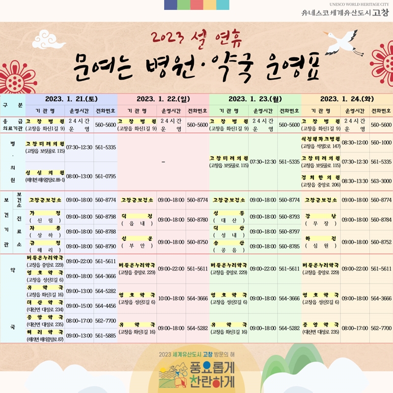 지역응급의료기관인 고창종합병원은 24시간 응급실을 운영하고 고창군보건소와 10개 지역 보건진료소도 연휴 4일간 일정별로 진료가 정상 운영된다. 또한 일반 의료기관과 약국은 신청 일자별 문여는 병·의원 4개소와 약국 6개소가 지정 운영되어 연휴기간 비상진료체계 유지로 진료로 인한 군민의 불편을 해소할 계획이다.