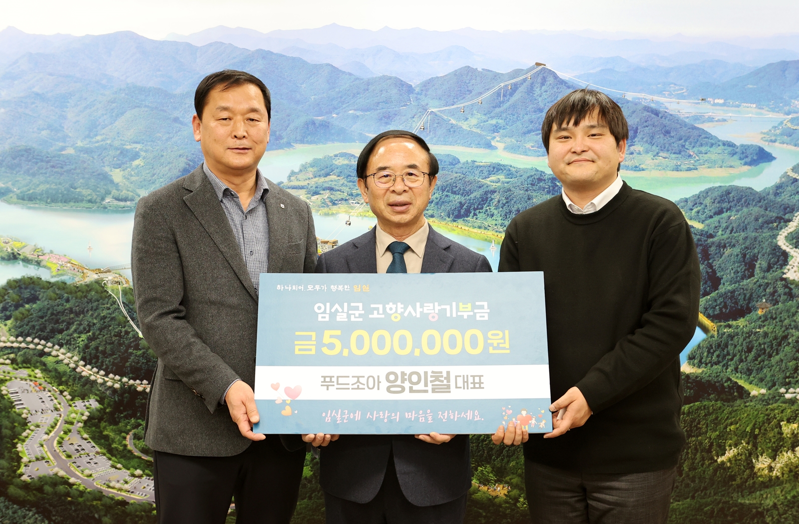 양 대표는 지난 17일 임실군청을 방문, 심 민 군수를 만나 “할아버지 고향이 임실이고, 임실군 농산물을 많이 유통하고 있어 그 인연으로 기부를 결심했다”며 연간 최대 한도액인 500만 원을 기부했다.
