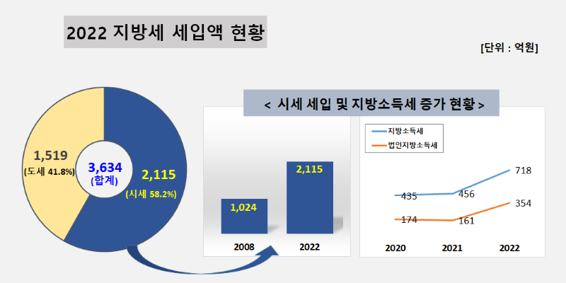 도세(道稅)를 포함하면 지방세 수입액은 3,634억 원(시세 2,115억 원, 도세 1,519억 원)이며 이 또한 역대 최대금액이다.