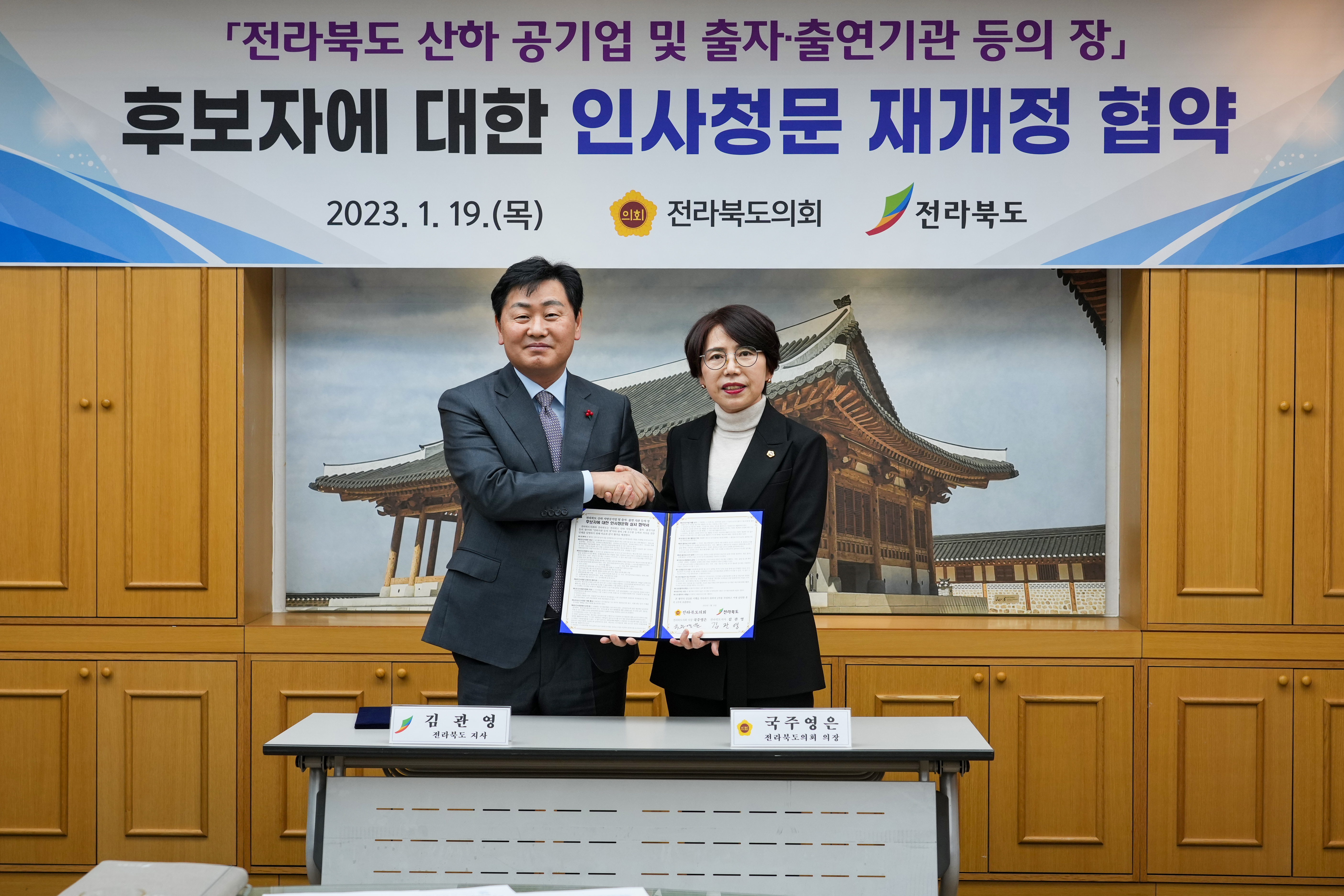 [정치=뉴전북] 국주영은 전라북도의회 의장과 김관영 전라북도지사는 1월 19일 도의회 의장실에서 ‘전북도 산하 공기업 및 출자·출연기관 등의 장’ 인사청문회 실시 재개정 협약을 체결했다.