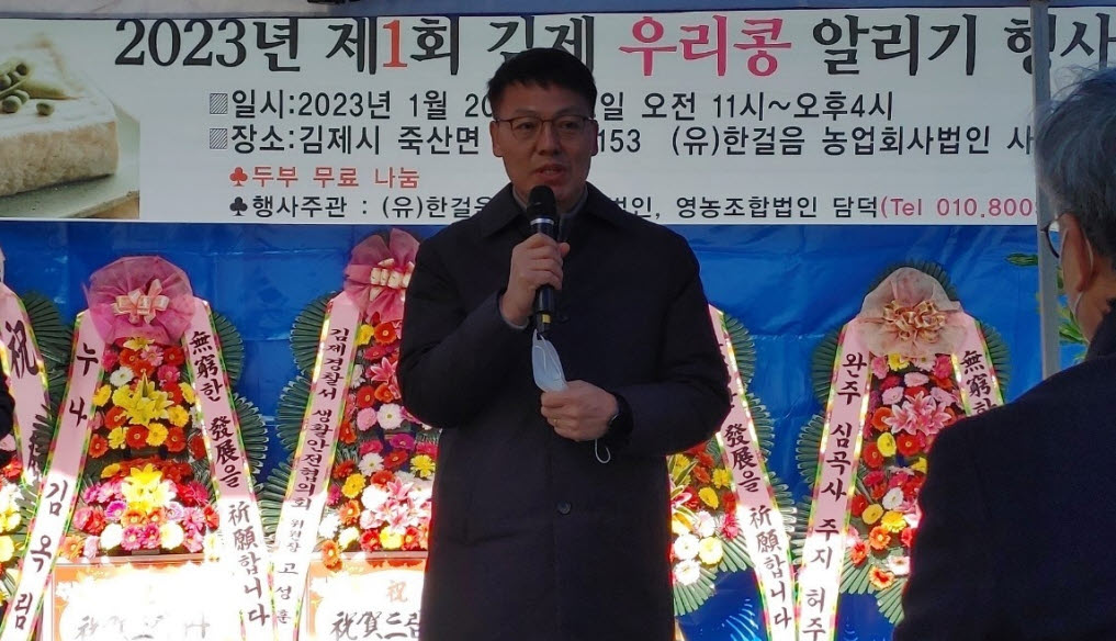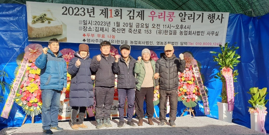 [경제=뉴전북] 김제시 죽산면 (유)한걸음 농업회사 법인(대표 김광배)과 영농조합법인 담덕이 주관하여 20일(금) 11시 죽산면 법인 소재 앞마당에서 설 명절을 맞이하여 “2023년 제1회 김제 우리콩 알리기 행사”를 통해 두부 무료 시음장을 펼쳤다.
