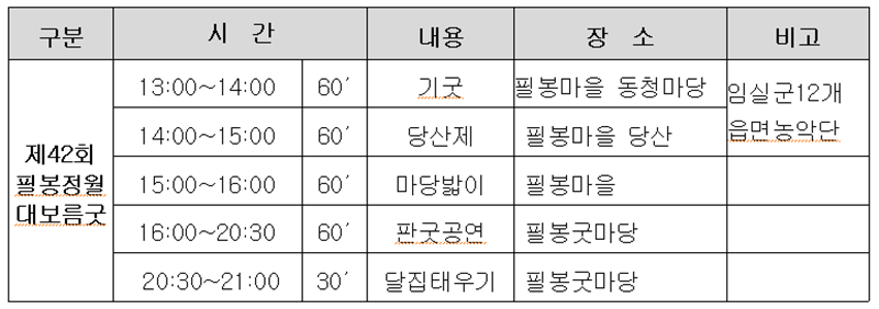 필봉농악은 대한민국을 대표하는 국가무형문화재로 유네스코 인류무형문화유산으로 등재된 농악으로서 세계가 인정한 소중한 마을문화유산이요 삶의 문화이다. 필봉농악은 전통적으로 필봉마을에서 행해져 오던 마을굿 본연의 가치와 형태 그대로를 계승하고 있다는 평가를 받고 있다. 제42회째를 맞이하는 필봉정월대보름굿은 오랜 전통과 역사만큼이나 대중축제로서 전국적인 인지도를 가지고 있다. 필봉 굿판의 푸진 굿 푸진 삶 속에서 흥과 함께 신명으로 올 한해 넉넉하게 여유로운 삶의 주인이 되어 보길 바란다.