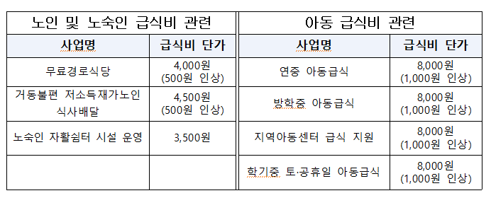 이들 무료 경로식당 운영 지원 및 거동불편 저소득 재가노인 식사배달 지원사업은 급식단가가 각각 4,000원과 4,500원이 책정됐다.