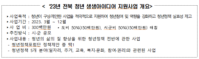 [도정=뉴전북] 전라북도는 청년의 정책 참여 강화 및 청년정책 실효성 제고를 위해 오는 28일까지 ‘2023년 청년 생생아이디어 지원 사업’을 공모한다.