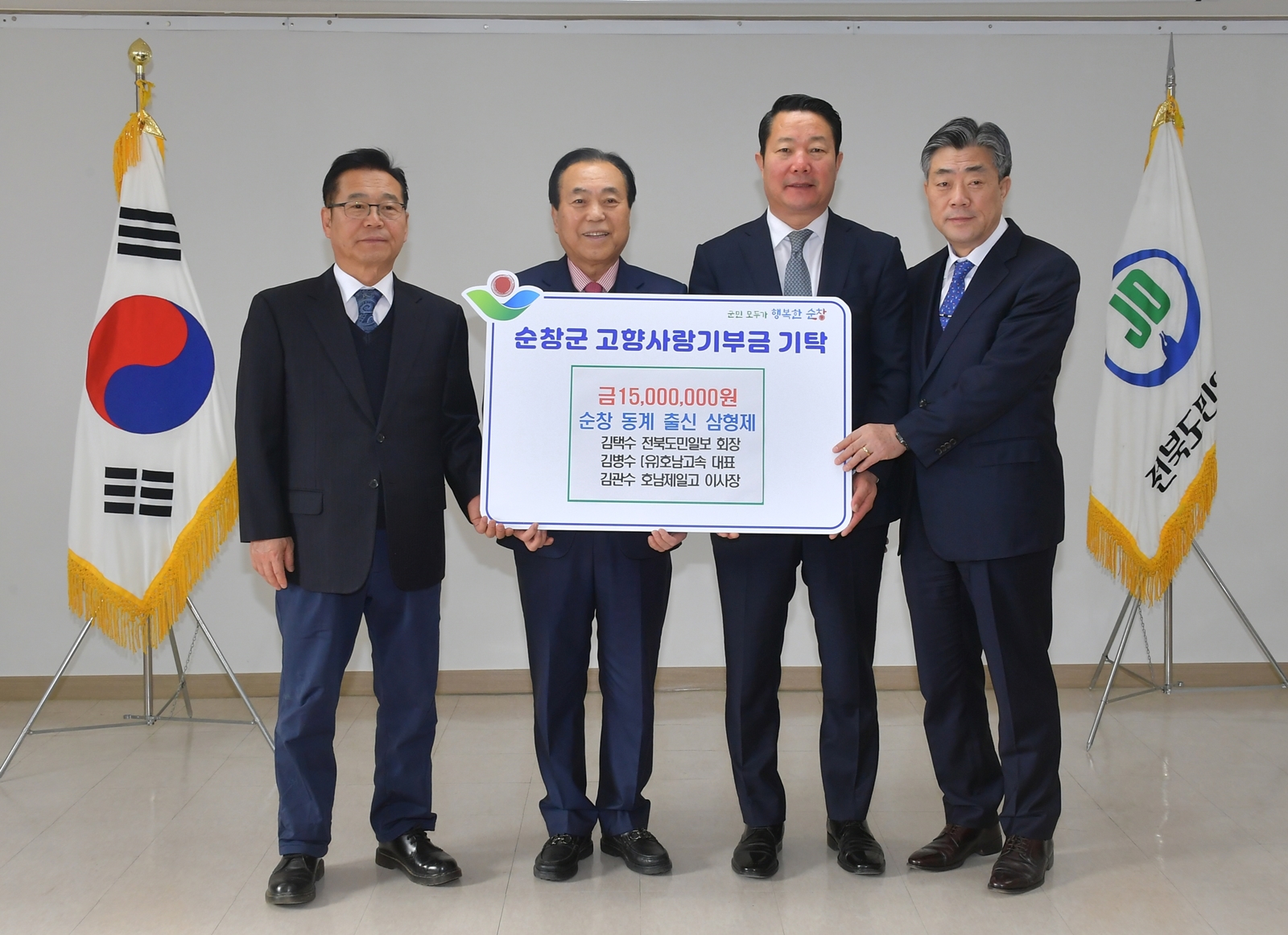 [순창=뉴전북] 고향을 사랑하는 순창군 동계면 출신 삼형제가 한자리에 모여 고향사랑기부금 1500만 원을 전북 순창군에 기부해 화제가 되고 있다.