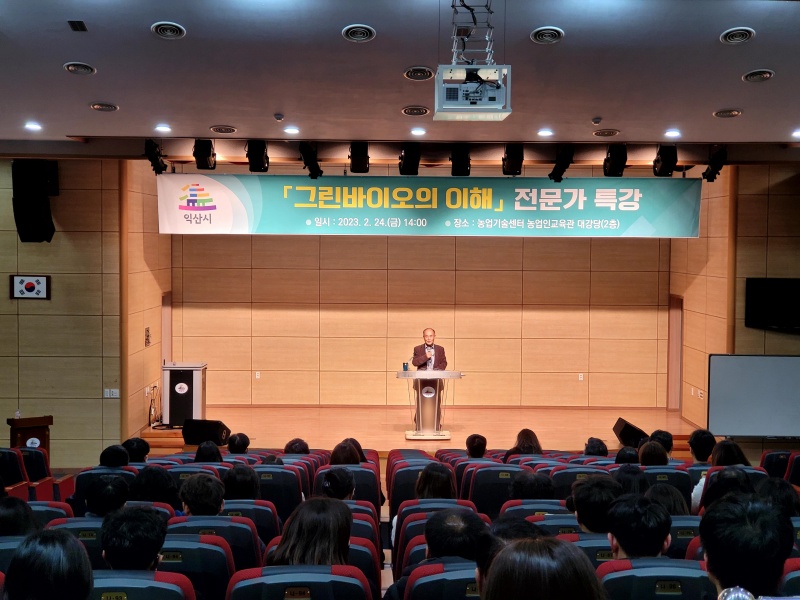 24일 시는 전 부서 공무원과 농민단체 회원 등 250여 명이 참석한 가운데 농업기술센터 내 농업인 교육관에서 익산시 명예농업 시장이자 농업경제학 전문가인 정명채 박사의‘그린바이오의 이해’특강을 진행했다.