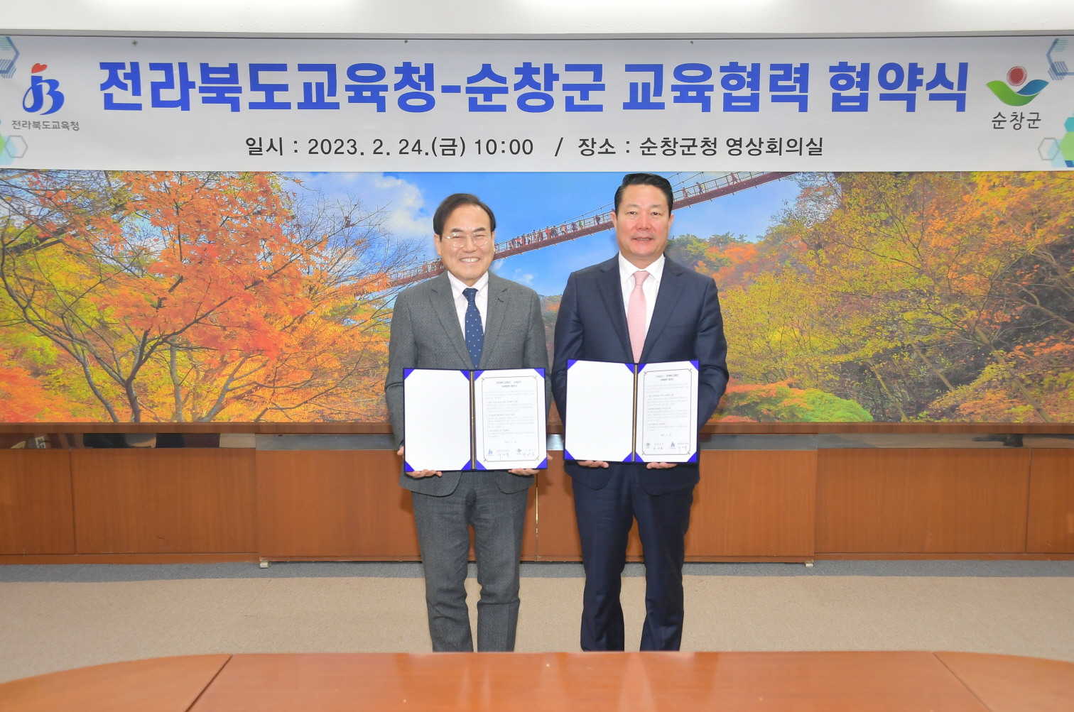 [순창=뉴전북] 전북교육청 서거석 교육감과 최영일 순창군수가 24일 순창군청 2층 영상회의실에서 지역 교육분야 협력행정 강화를 위한 업무 협약을 체결했다.