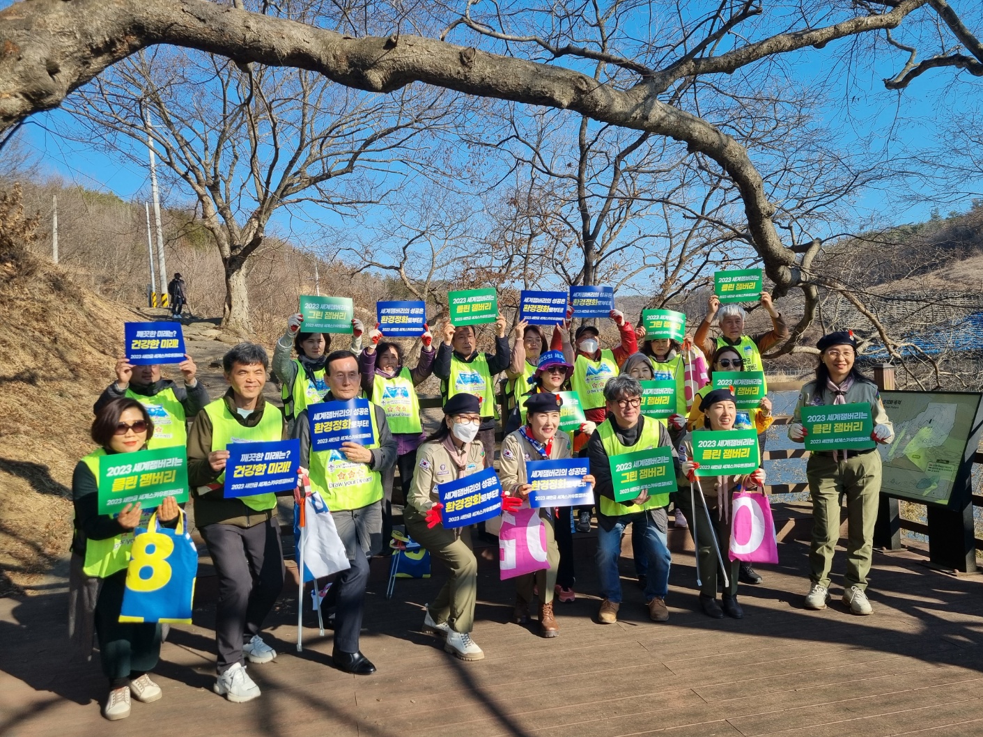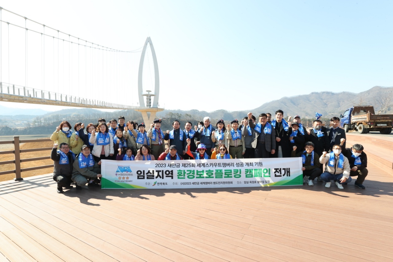 [도정=뉴전북] 전라북도와 2023 새만금 세계스카우트잼버리 범도민지원위원회(이사장 김동수)는 “2023 새만금 세계 잼버리 성공 개최를 기원하며 지난 27일 임실 옥정호 붕어섬 출렁다리 일원에서 ”그린(green) 잼버리 실천 캠페인“을 전개했다.