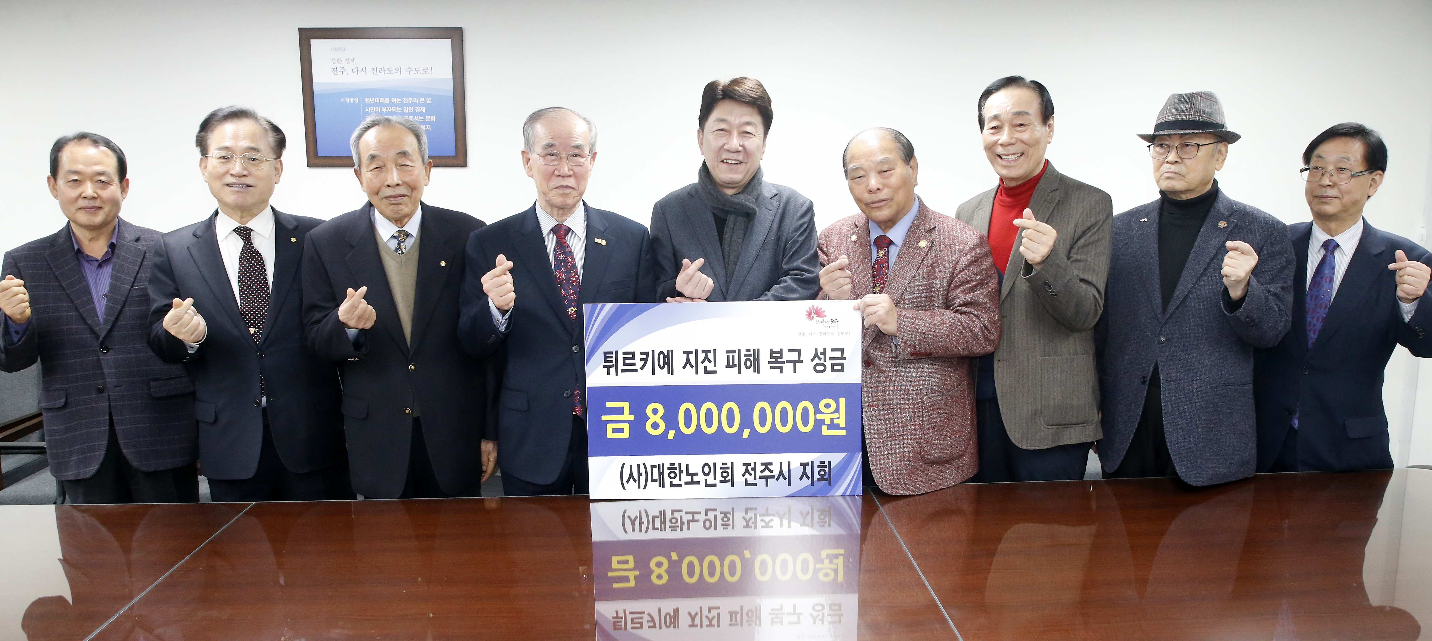 우범기 전주시장은 따뜻한 마음을 모아주신 대한노인회 전주시지회와 모든 경로당 회원들게 감사드린다면서 정성과 마음을 모아 마련한 소중한 성금이 튀르키예·시리아의 이재민 구호와 피해복구에 도움이 되길 바란다고 말했다.