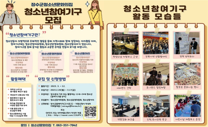 [장수=뉴전북]장수군청소년문화의집은 지역에서의 청소년의 자치활동 보장과 청소년 정책 제안 반영으로 청소년의 긍정적인 성장 지원과 참여를 활성화하기 위해 청소년참여기구 참여 청소년을 오는 17일까지 모집한다.