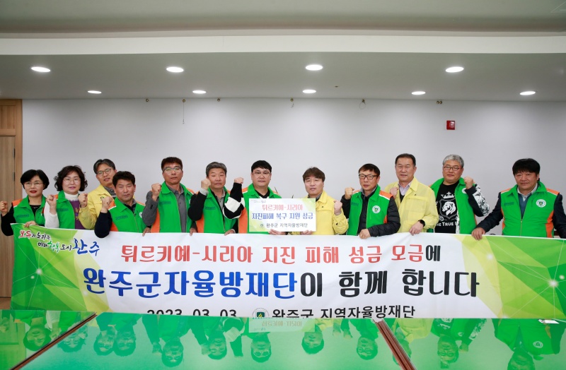 3일 완주군에 따르면 지역 자율방재단은 튀르키예 및 시리아 지역에 발생한 지진 피해로 어려움을 겪고 있는 이재민들을 돕기 위해 13개 읍·면 방재단 대표들이 자발적으로 성금 활동에 참여했다.