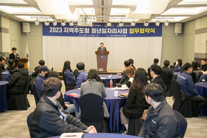 [군산=뉴전북] 군산시가 청년들의 일자리 창출 지원과 동시에 지난 10일  베스트웨스턴 군산호텔에서 ‘2023 지역주도형 청년일자리사업’ 협약식을 시작으로 정착 지원으로 청년들의 일자리와 정착지원에 나서게 된다.