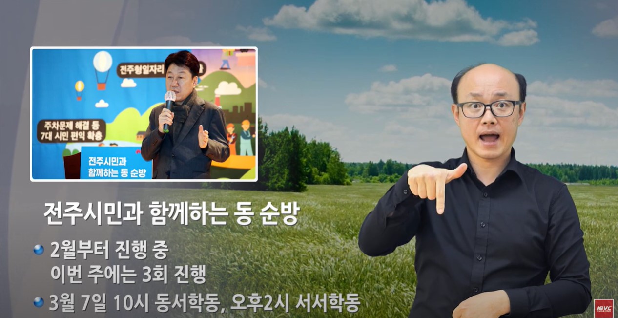 [전주=뉴전북] 전주시는 청각장애인의 정보접근권 향상과 장벽 없는 행정서비스를 제공하기 위해 매주 주간행사와 동향, 생활정보 등의 시정 소식을 수어로 소개하는 영상을 제작해 서비스를 제공하고 있다고 14일 밝혔다.