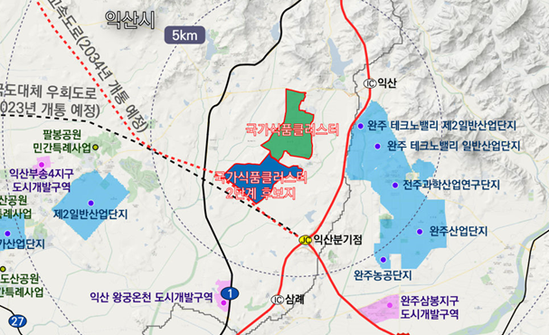 익산 국가식품클러스터 2단계 국가첨단산단은 오는 ‘28년까지 익산시 왕궁면 일원에 3,855억원을 투자해 2.07㎢(63만평) 규모로 조성할 예정이며,