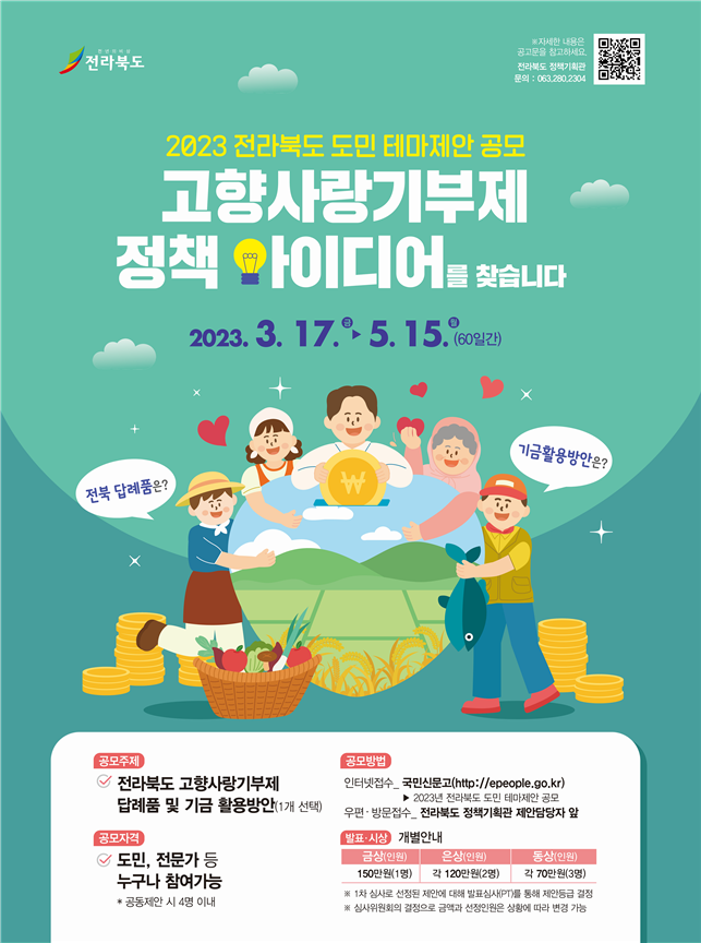 노홍석 전북도 기획조정실장은 “주민 생활과 밀접한 고향사랑기부제와 도정 핵심 현안인 전북특별자치도 관련 주제가 선정된 만큼 도민이 생활 속에서 체감할 수 있고 실현될 수 있는 정책이 발굴되기를 기대한다”며 “도민 모두가 함께 더 특별하고 더 새로운 전라북도를 만들어 갈 수 있도록 테마제안 공모에 적극 참여를 부탁드린다”라고 전했다.