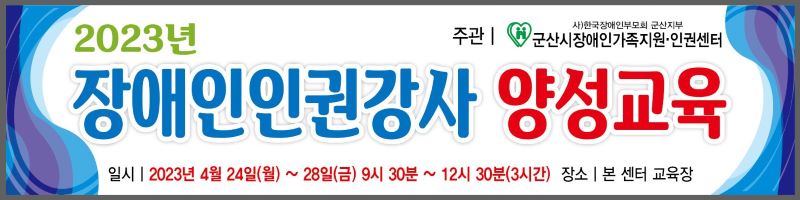 [군산=뉴전북] 군산시 위탁기관인 군산장애인가족지원인권센터는 장애와 장애인의 인식개선 및 인권개선을 위한 장애인 인권강사 양성교육을 오는 424일부터 28일까지 총 15시간을 진행한다고 밝혔다.