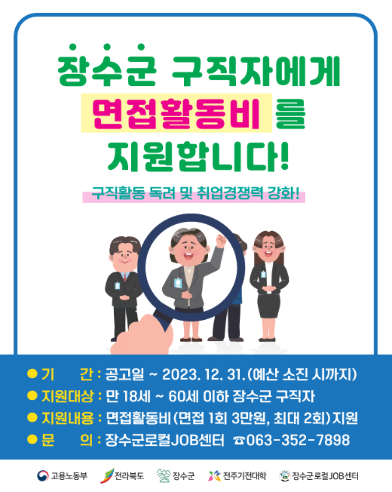 면접활동비 지원 대상은 관내 거주하는 만18~60세 미취업 구직자로, 지원사업 신청·문의는 장수군 로컬 JOB 센터(063-352-7898)로 하면 된다.