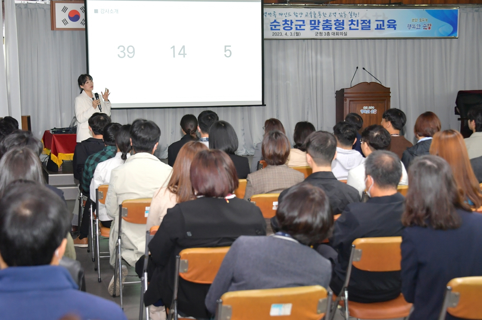[순창=뉴전북] 전북 순창군은 지난 3일 군청 3층 회의실에서 전 직원을 대상으로 군민이 행복한 친절행정 구현을 위한 2023년도 맞춤형 친절행정 서비스 교육을 실시했다.
