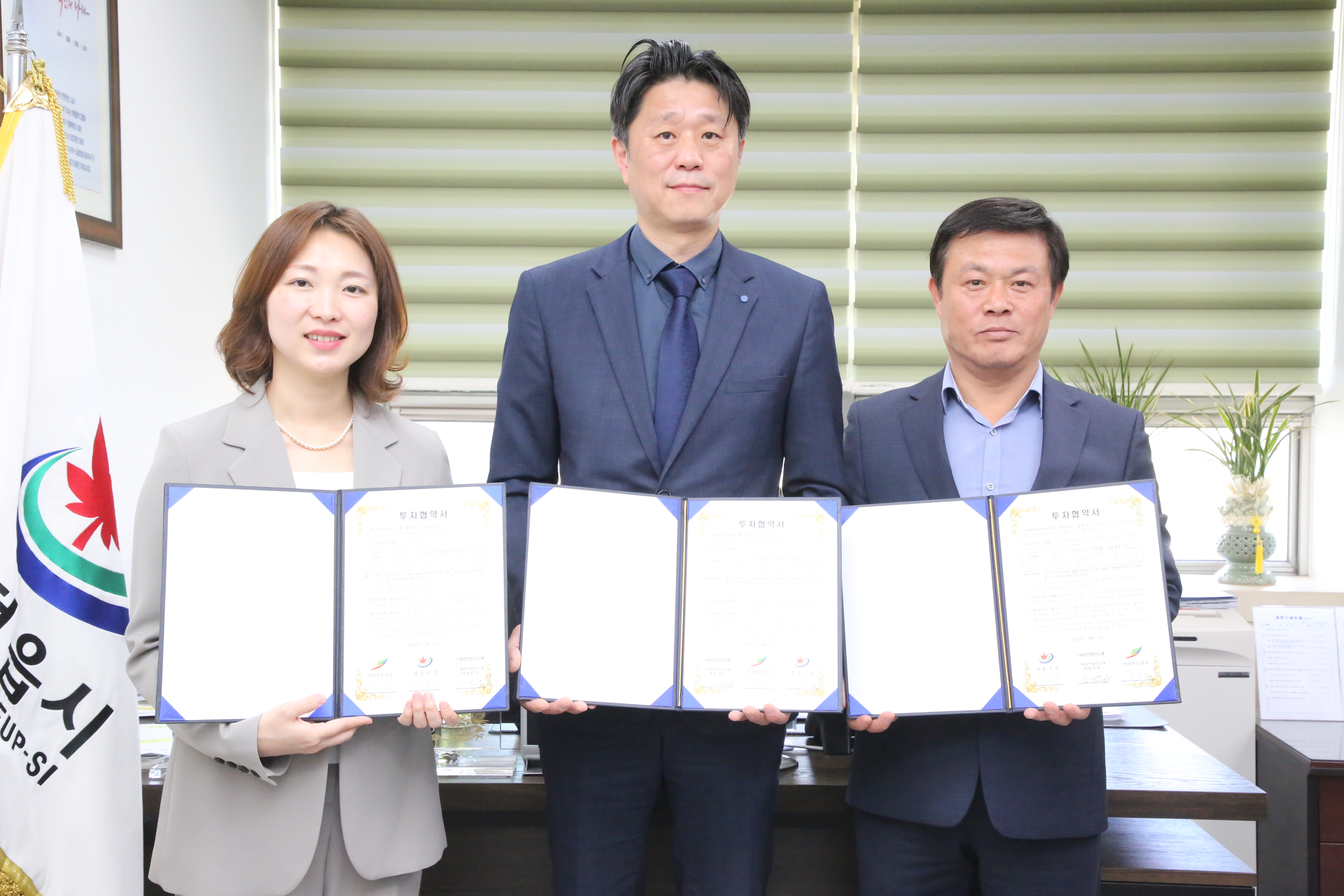 정읍시장실에서 진행된 협약식에는 이학수 정읍시장과 양선화 전북도 기업유치추진단장, 김대규 ㈜세라잔첨단소재 대표를 비롯한 기업 관계자 등이 참석했다.