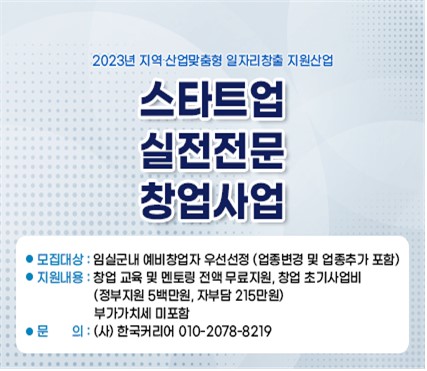 한편 스타트업 실전전문 창업사업에 대한 자세한 사항은 사단법인 한국커리어(010-2078-8219) 또는 임실군청 경제교통과 일자리창출팀(063-640-2454)으로 문의하면 된다.