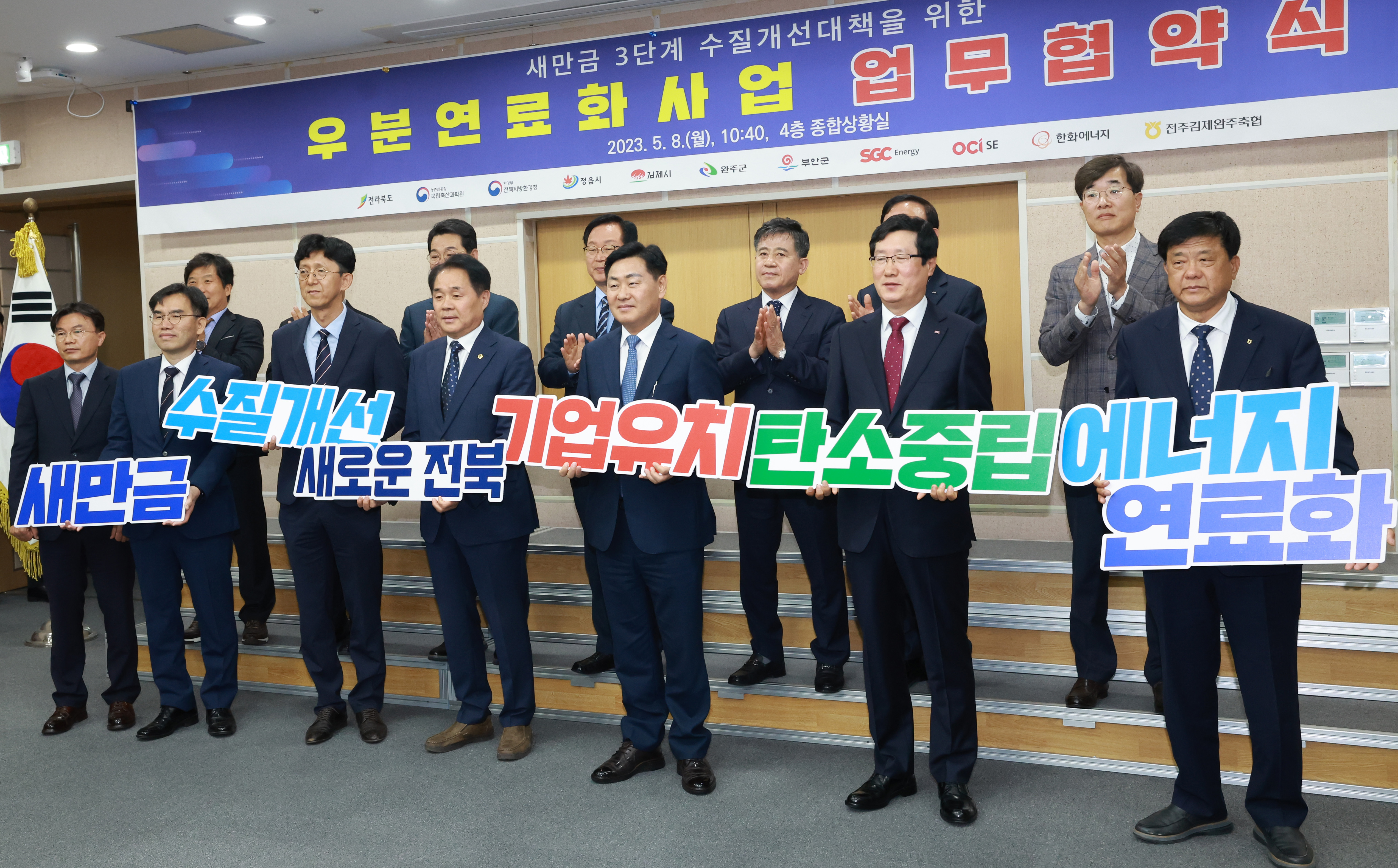 이날 협약은 김관영 도지사를 비롯 박범영 국립축산과학원장, 송호석 전북지방환경청장, 새만금 유역 내 4개 시·군(정읍, 김제, 완주, 부안) 단체장과 SGC에너지(주), OCI SE(주), 한화에너지(주) 대표, 김창수 전주김제완주축협 조합장이 참석했으며, 도의회 이병철 환경복지위원장도 동행해 협약을 축하하며 적극적인 협조를 약속했다.