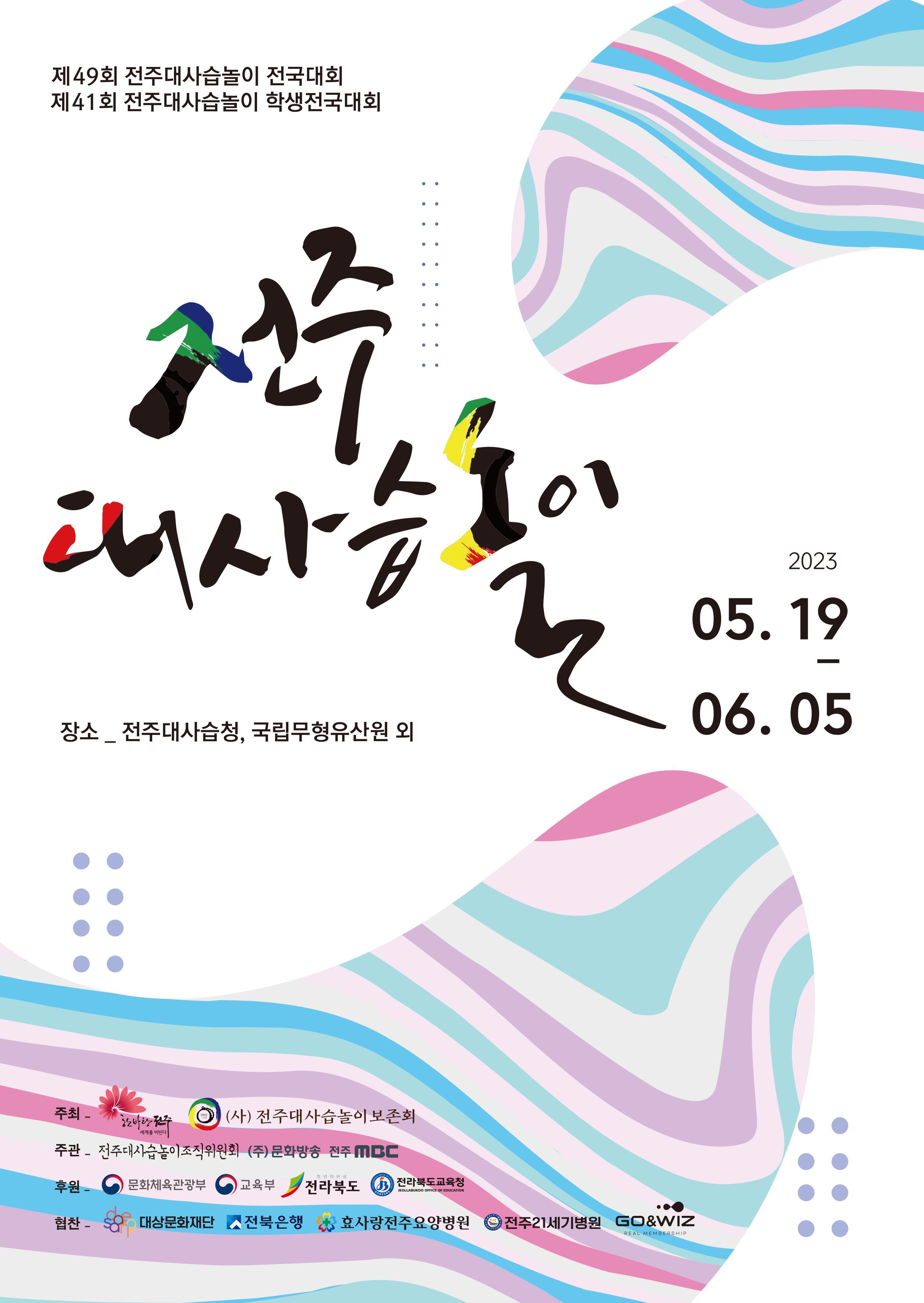 전주시와 (사)전주대사습놀이 보존회가 주최하고, 전주대사습놀이조직위원회와 ㈜문화방송, 전주 MBC가 주관하는 ‘제49회 전주대사습놀이 전국대회’와 ‘제41회 학생전국대회’가 오는 19일부터 6월 5일까지 18일 동안 국립무형유산원과 전주대사습청 등 전주 일원에서 개최된다.