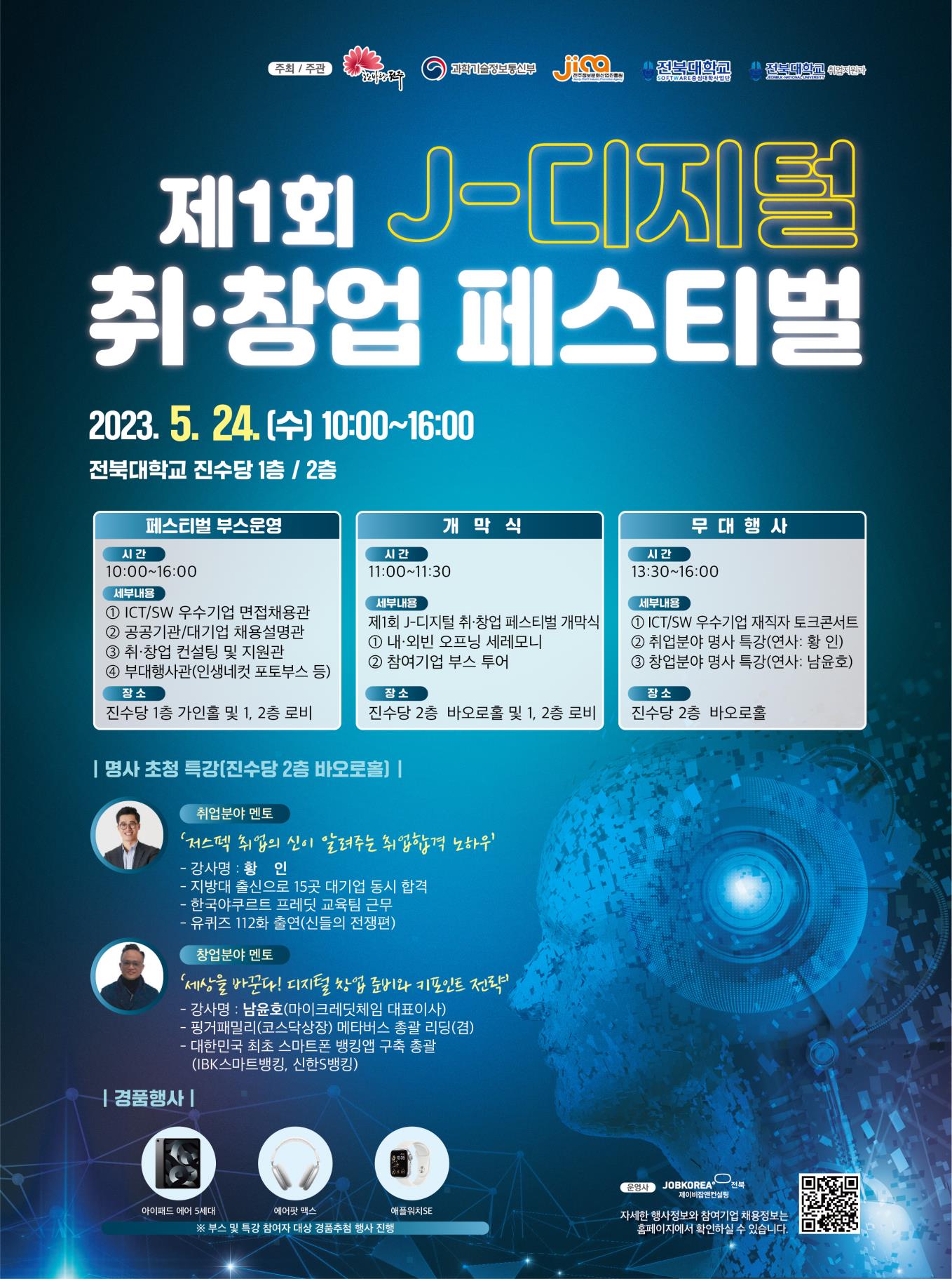 전주시와 전주정보문화산업진흥원, 전북대 SW중심대학사업단은 최근 챗GPT 등으로 확산된 산업 분야의 디지털 혁신에 대응하기 위해 오는 24일 오전 10시 전북대학교 진수당과 구정문 일대에서 ‘제1회 J-디지털 취·창업 페스티벌’을 개최한다.