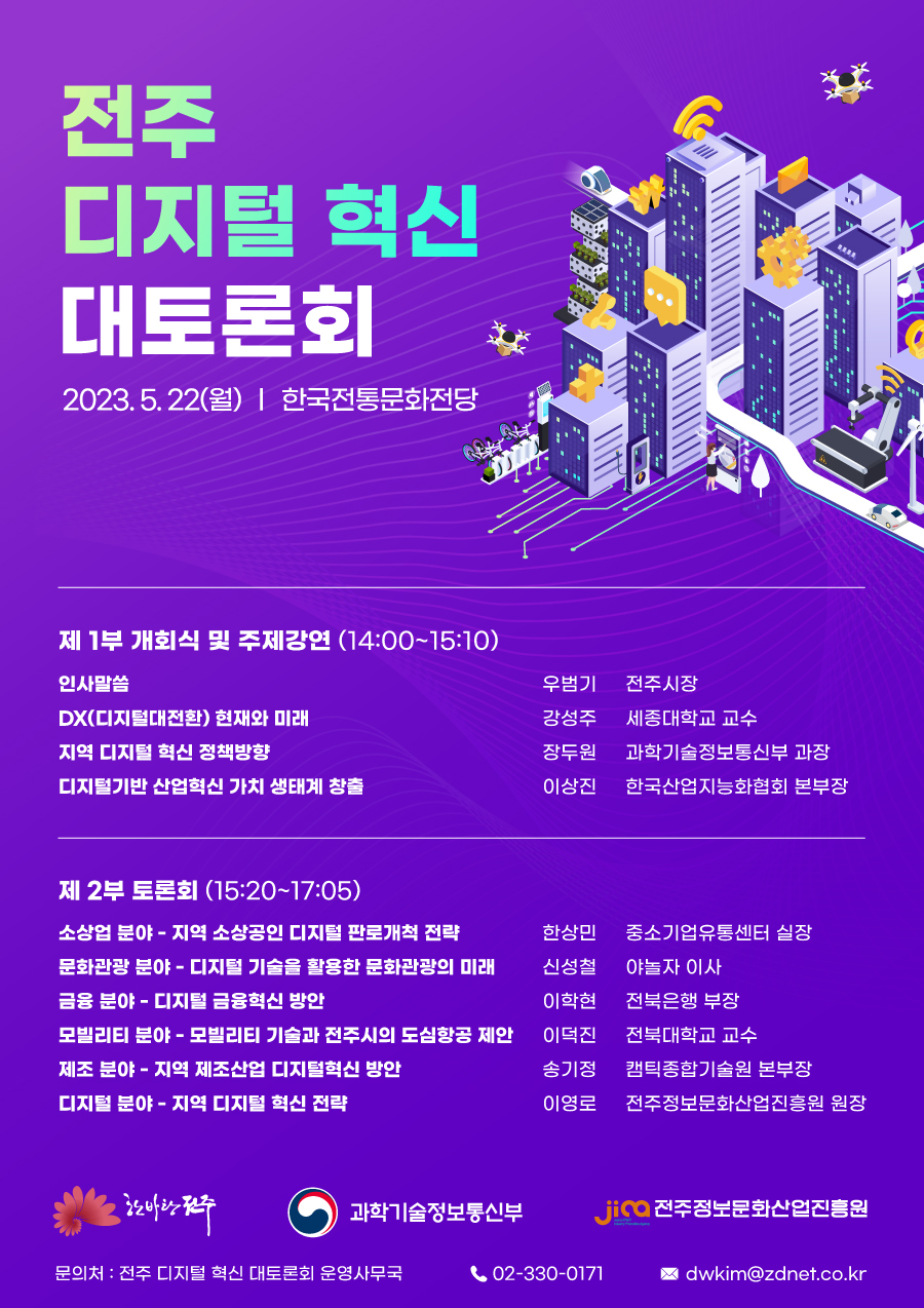 전주시와 전주정보문화산업진흥원은 산업 전반에 걸쳐 확산하는 디지털 혁신의 구체적인 해법을 모색하기 위해, 오는 5월 22일 오후 2시 한국전통문화전당 대공연장에서 ‘전주 디지털혁신 대토론회’를 개최한다.