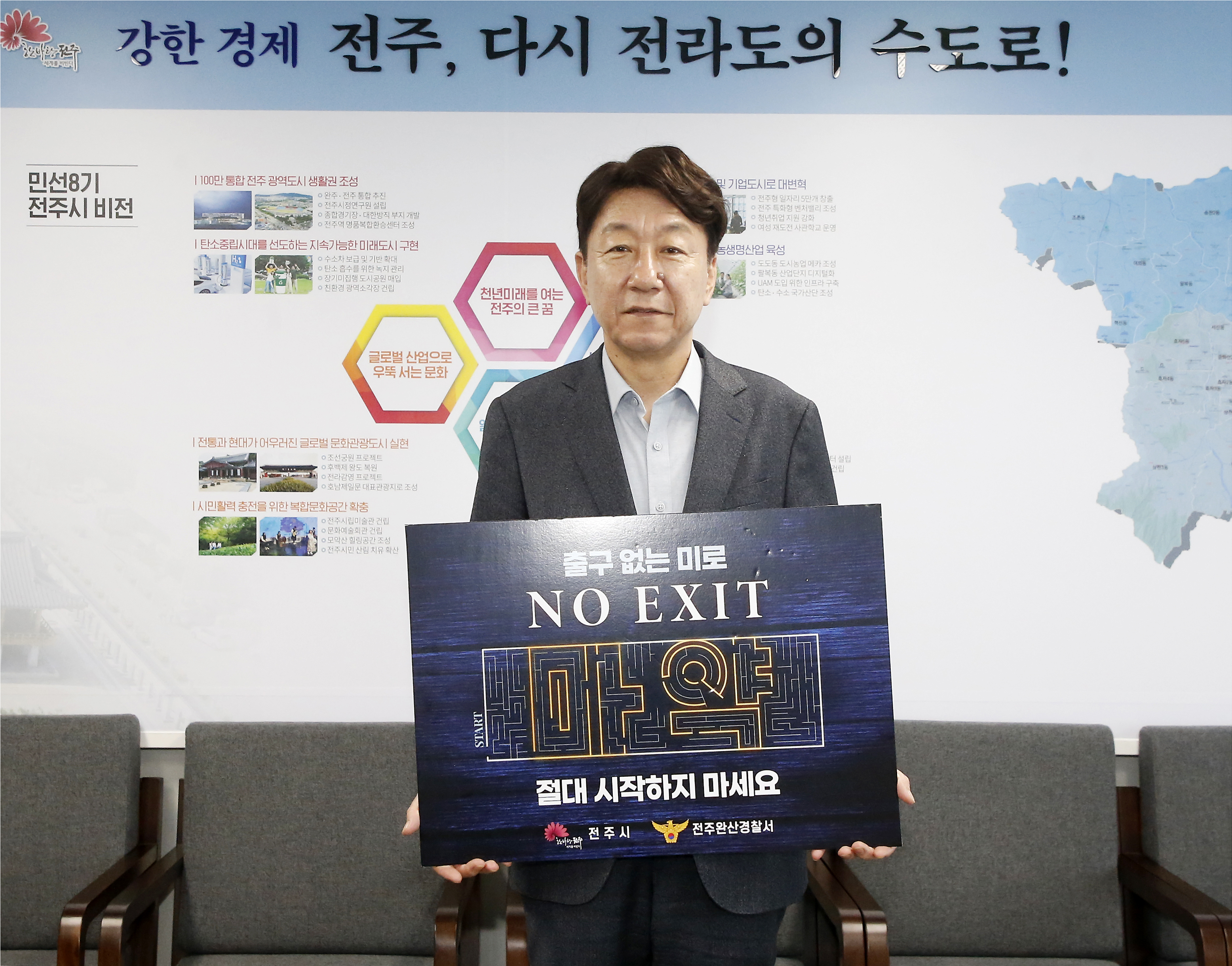 18일 전주시에 따르면 우 시장은 ‘출구 없는 미로, NO EXIT, 마약 절대 시작하지 마세요’라는 문구가 적힌 피켓을 들고 찍은 사진을 SNS에 게시하며 마약 범죄 근절을 위한 ‘NO EXIT’ 캠페인에 참여했다.