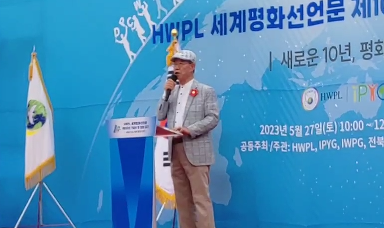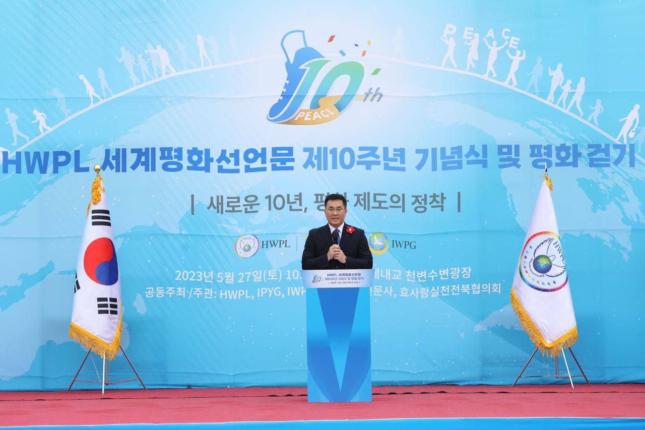 HWPL, 세계평화선언문 제10주년 기념식 및 평화 걷기에 글로벌12지부 최중일 명예이사가 대회사를 전하고 있다.