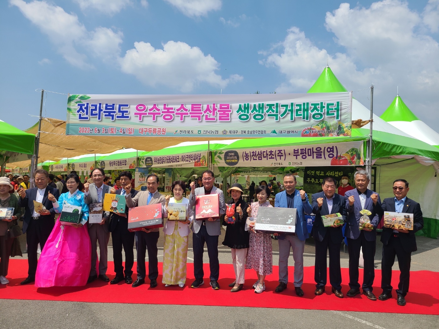 [도정=뉴전북] 전북도와 농협중앙회전북지역본부가 주관하고 대구경북호남향우회가 주최한‘대구경북 호남향우회 생생직거래장터’가 지난 3~4일 대구시 두류공원에서 성황리에 열렸다.