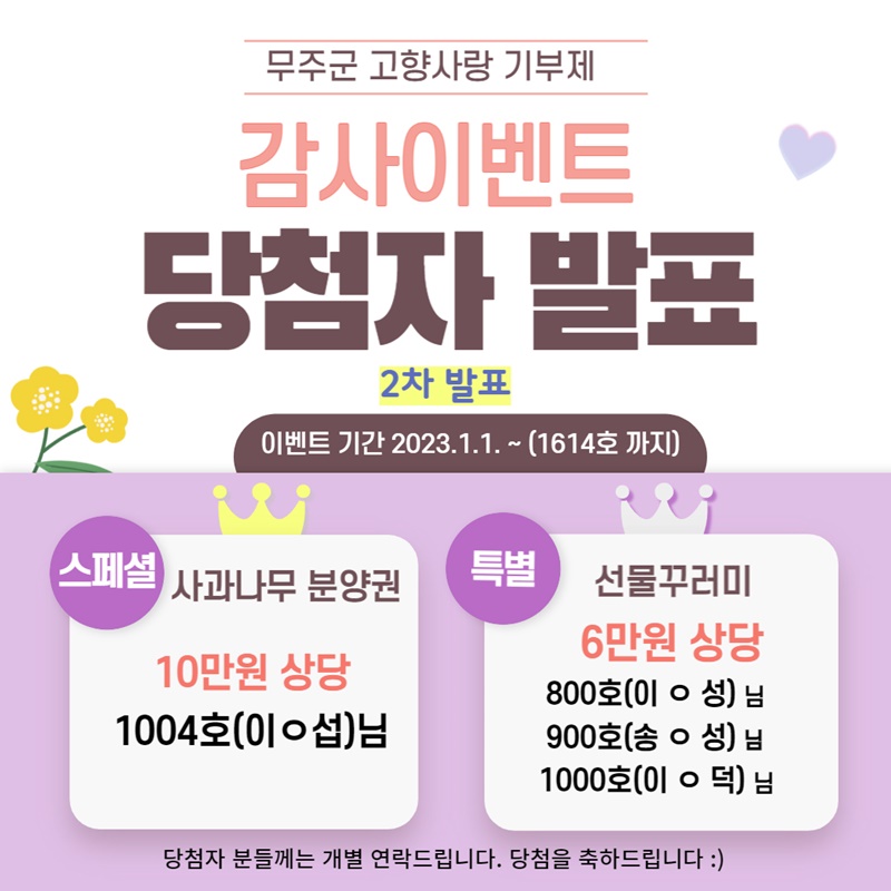 [무주=뉴전북] 무주군이 지난 3월에 이어 ‘무주군 고향사랑기부제 감사이벤트(이하 감사이벤트)’ 2차 당첨자를 발표해 눈길을 끌고 있다.