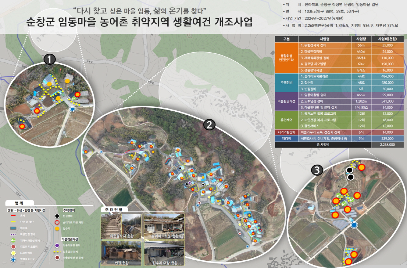 이번 공모사업에 선정된 유등 외이마을은 방치된 공폐가가 11호, 슬레이트 비율이 82.9%, 30년 이상 노후주택 비율이 75.7%이며 적성면 임동마을 역시 공폐가가 6호, 슬레이트 비율이 65.9%, 30년 이상 노후주택 비율이 76.3%에 이르는 등 주민 정주 여건 개선이 시급한 마을이다.