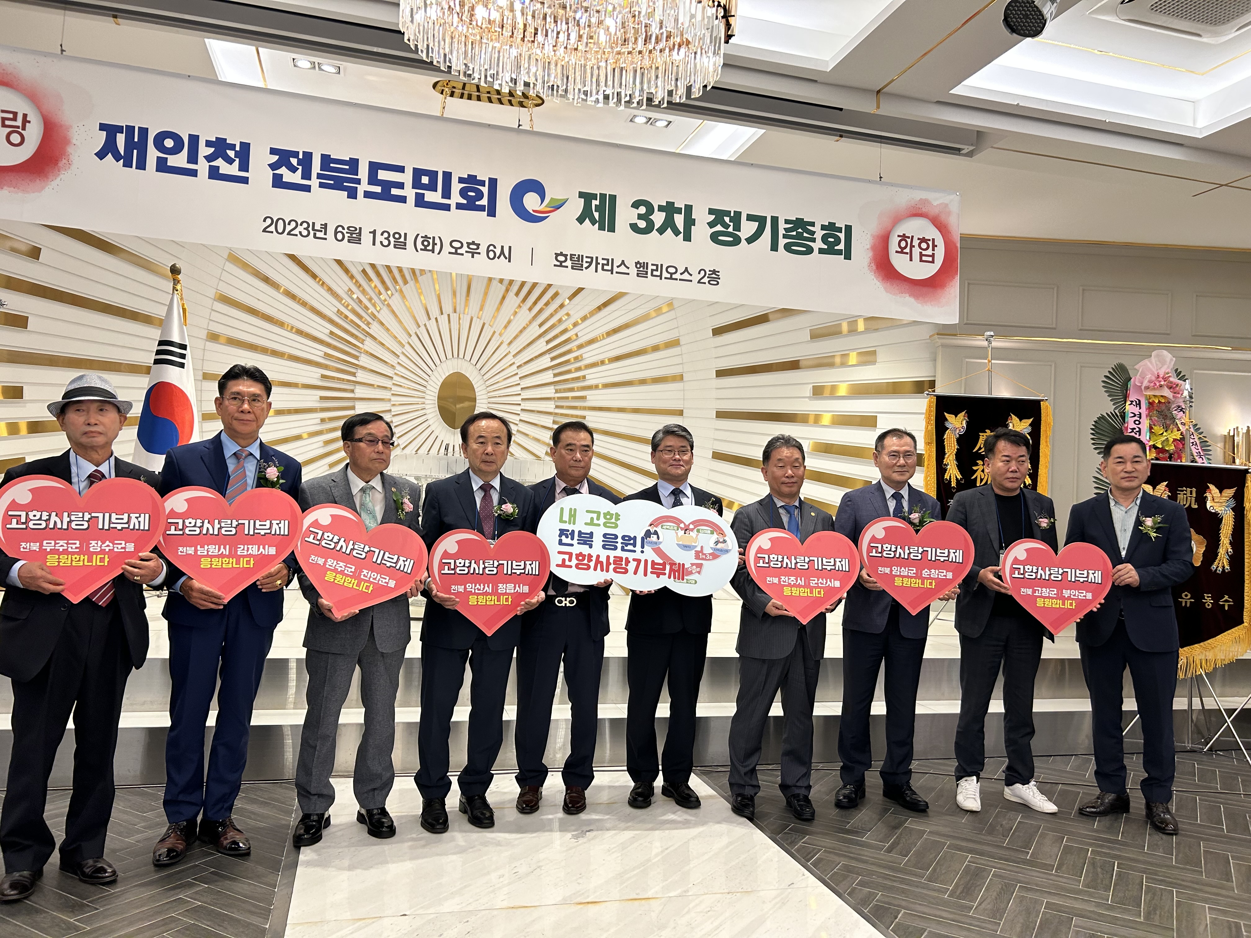 이어서 인천광역시 전북도민회(회장 임영배)는 전북 고향사랑기부제의 성공적 정착을 기원하며 기부 홍보 퍼포먼스를 펼치고, 회원 모두가 고향사랑기부에 적극 동참하겠다는 의지를 밝혔다.