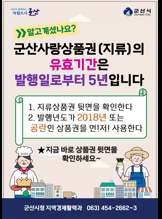 [군산=뉴전북] 군산시가 군산사랑상품권의 유효기간에 대해 적극 홍보하고 나섰다.