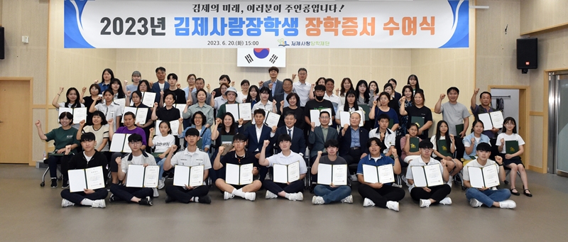 [김제=뉴전북] 재단법인 김제사랑장학재단(이사장 정성주)에서는 지난 20일 김제시청 3층 대회의실에서 정성주 이사장을 비롯해 김제사랑장학재단 임원과 장학생 및 학부모 100여 명이 참석한 가운데 ‘2023년 김제사랑장학생 장학증서 수여식’을 가졌다.