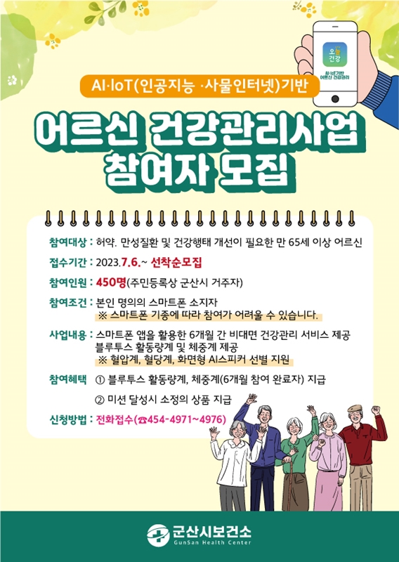 [군산=뉴전북] 군산시보건소는 만 65세 이상 어르신을 대상으로 스마트폰을 활용해 실시하는 ‘AI·IoT기반 어르신 건강관리사업’신규참여자 450명을 오는 7월 6일부터 선착순 모집한다고 밝혔다.