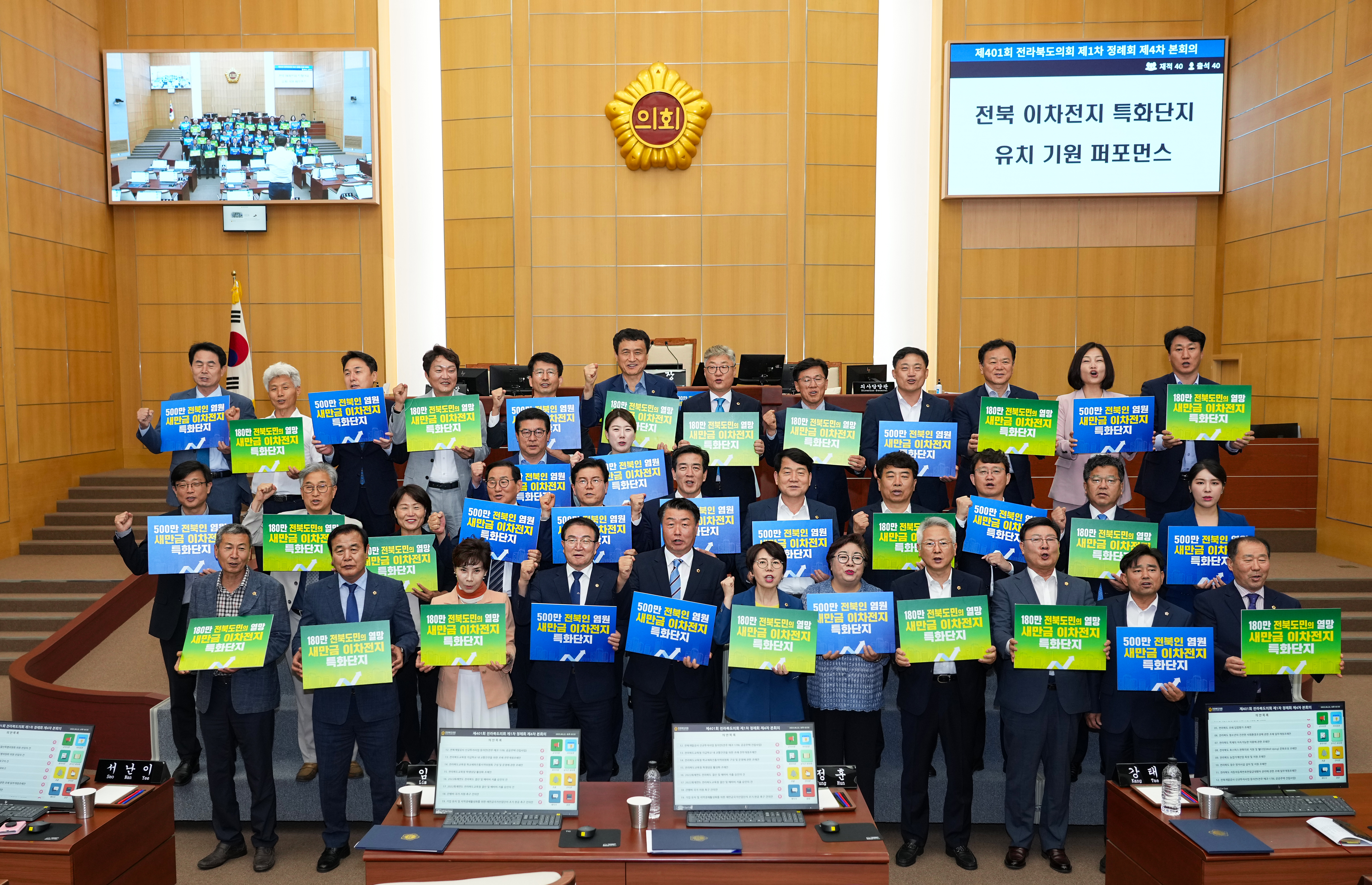 이날 의원들은 본회의장에서 500만 전북인 염원과 180만 도민의 열망을 담아 ‘이차전지 특화단지는 전북으로!’라는 문구가 새겨진 피켓을 들고 구호를 외치며 이차전지 특화단지 유치를 기원했다.