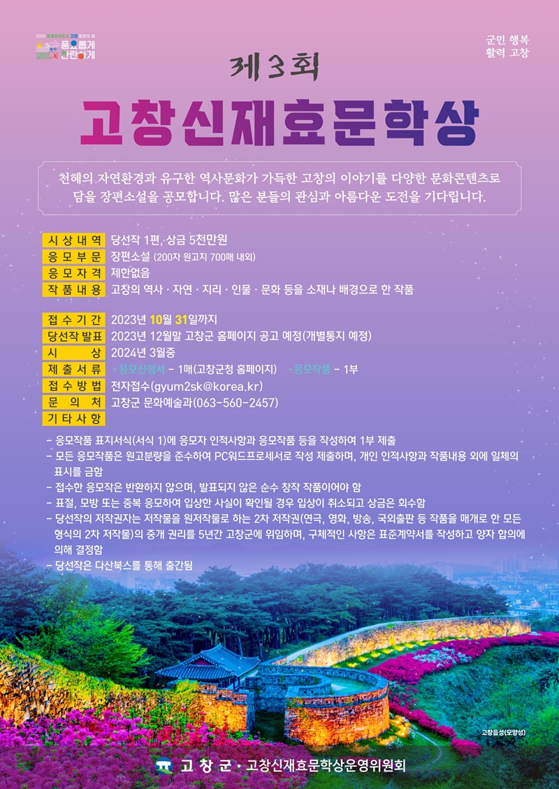 [고창=뉴전북] 세계유산도시 고창군이 올해로 3회째 고창신재효문학상 작품 공모를 진행한다고 26일 밝혔다.