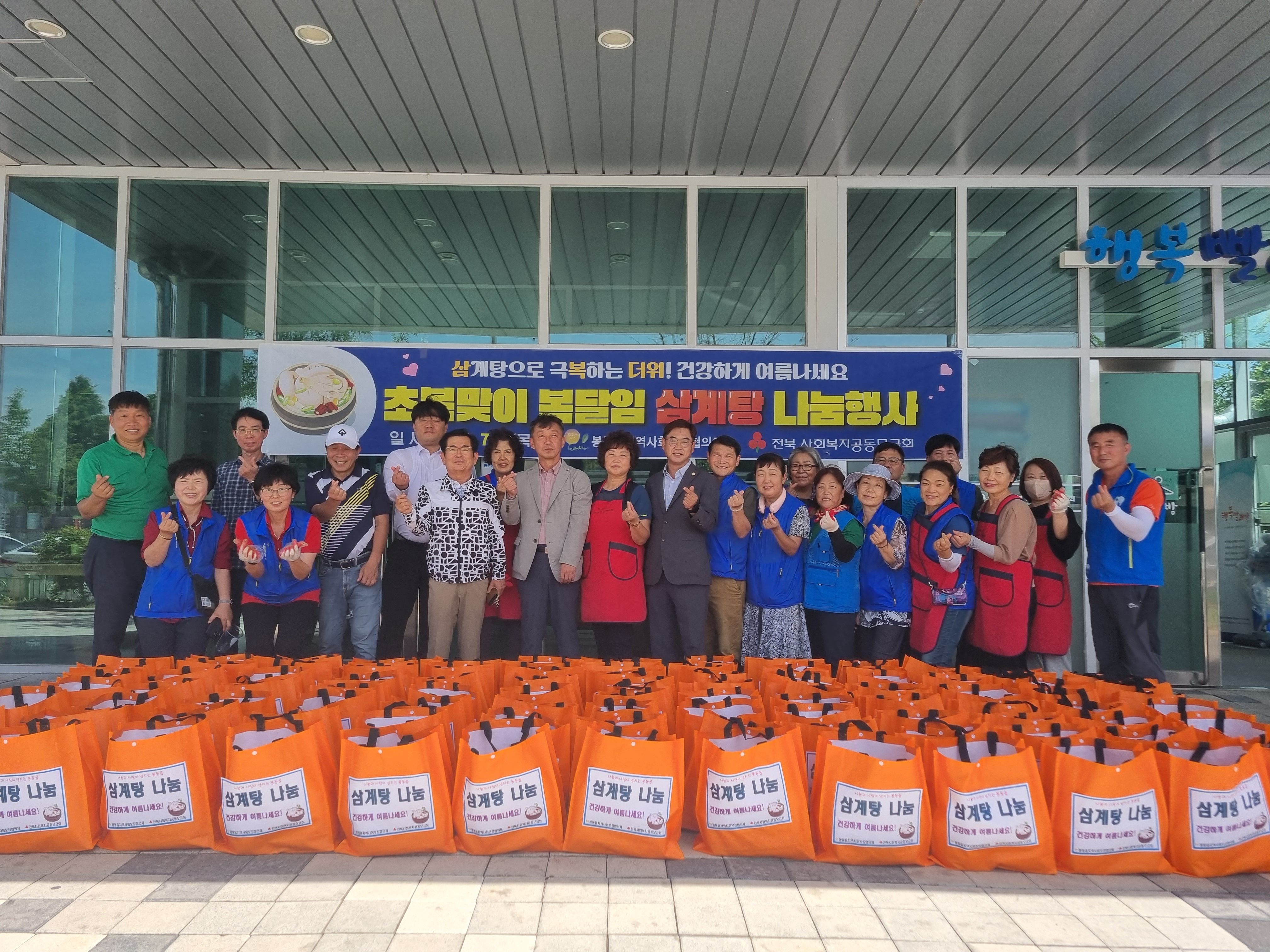 [완주=뉴전북] 완주군 봉동읍 지역사회보장협의체(공동위원장 한순철, 국인숙)가 초복을 앞두고 지역 내 취약계층 100가구 및 관내 시설에 삼계탕을 전달하는 복(伏)달임 삼계탕 나눔 행사를 진행했다.