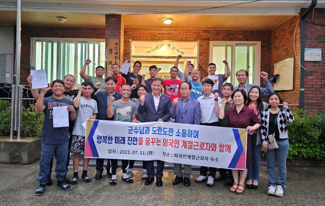 [진안=뉴전북]전춘성 진안군수는 지난 11일 저녁 농번기 농촌 일손 부족 해결을 위해 MOU 체결국인 필리핀 카비테주 마갈레스시 출신의 외국인 계절근로자 44명이 머물고 있는 공동숙소를 방문·격려했다.