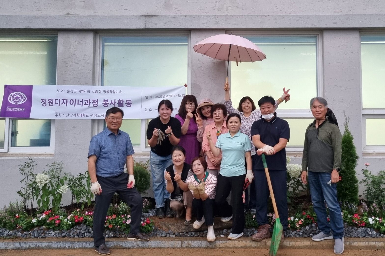 이번 학습 나눔 활동은 정원 디자이너 김순정 강사를 포함한 수강생 10명이 참여했으며, 옥천인재숙 지성관 앞에 학생들이 포토존으로 활용할 수 있도록 장미, 남천, 로즈메리, 안젤로니아 등을 심어 휴식과 정서적 안정감을 줄 수 있도록 꾸며졌다.