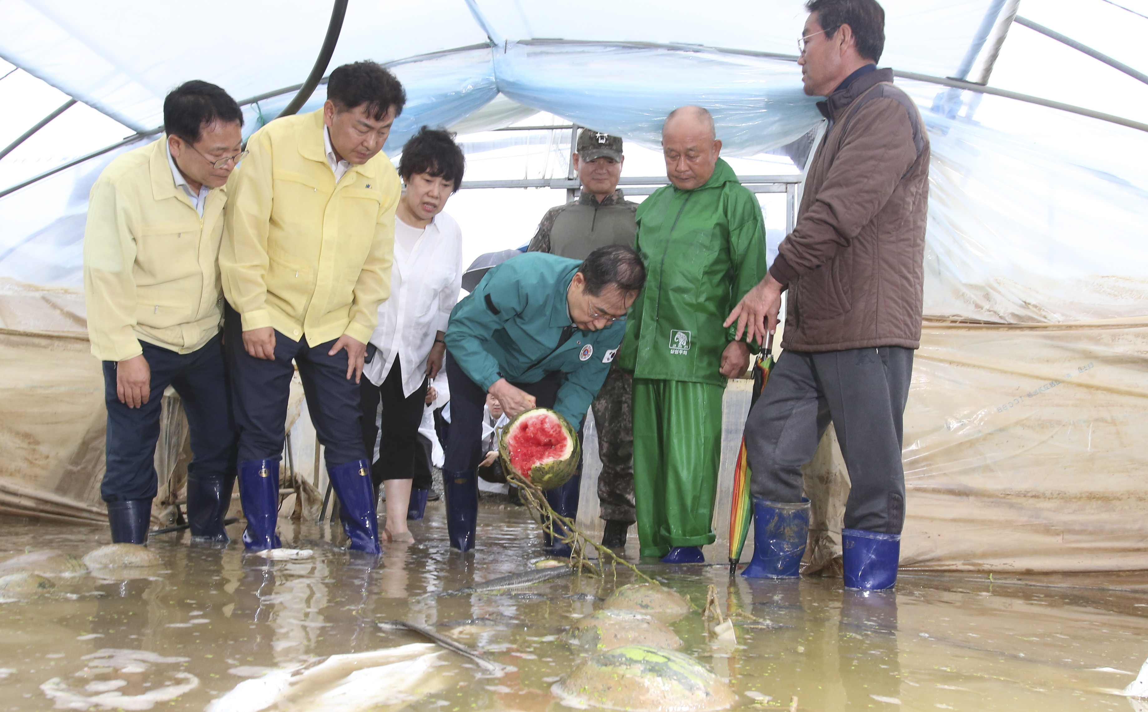 [도정=뉴전북] 한덕수 국무총리는 18일 오후 집중호우로 인해 침수피해를 입은 익산시 용안면 소재 비닐하우스 피해 농가를 찾아 피해상황을 살피며 신속한 복구지원이 이뤄질 수 있도록 관계기관에 지시했다.